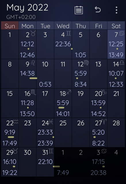 A na slici ispod možete videti kada će Mesec biti u praznom hodu u maju.